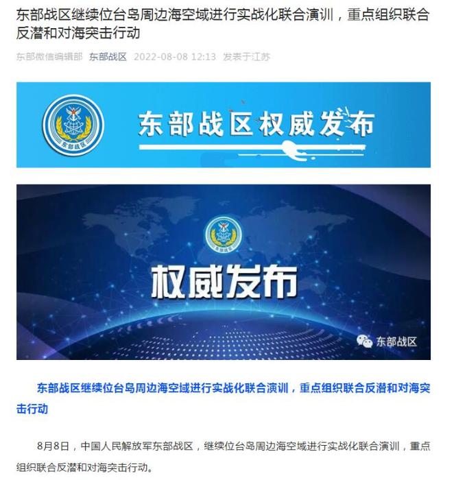 中新網(wǎng)8月8日電 據(jù)東部戰(zhàn)區(qū)微信公眾號(hào)消息,8月8日,中國(guó)人民解放軍東部戰(zhàn)區(qū)繼續(xù)位臺(tái)島周邊??沼蜻M(jìn)行實(shí)戰(zhàn)化聯(lián)合演訓(xùn),重點(diǎn)組織聯(lián)合反潛和對(duì)海突擊行動(dòng)。