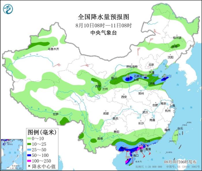 8月10日08時至11日08時,新疆伊犁河谷和沿天山附近、青海東部、寧夏中部、陜西北部、山西中北部、河北南部、山東大部及廣東中南部、海南島、廣西中南部等地有中到大雨,其中,陜西北部、山西中部、河北南部、山東半島西部、廣東南部、海南島西部、廣西南部等地的部分地區(qū)有暴雨或大暴雨(100~220毫米)。甘肅西部、內(nèi)蒙古東部、廣東南部、廣西南部、海南島等地部分地區(qū)有4~6級風,沿海地區(qū)陣風可達7~8級。
