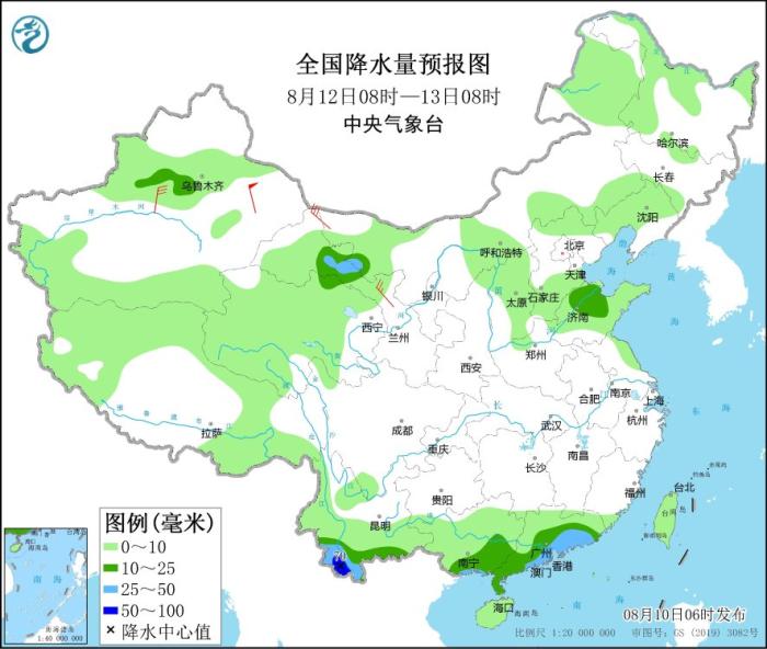 8月12日08時至13日08時,新疆沿天山地區(qū)、甘肅西部、山東北部、廣東中南部、廣西南部、云南南部等地的部分地區(qū)有中到大雨,其中,云南西南部等地局地有暴雨(50~70毫米)。內(nèi)蒙古西北部、甘肅河西等地部分地區(qū)有4~6級風,其中,新疆東部部分地區(qū)有7~8級風。