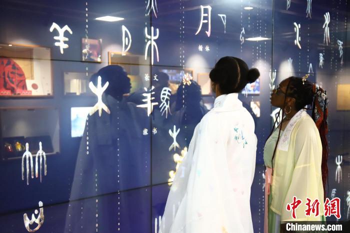外國留學(xué)生通過觸摸電子屏幕體驗(yàn)學(xué)習(xí)漢字文化、了解漢字的演變歷程。 隋翔 攝