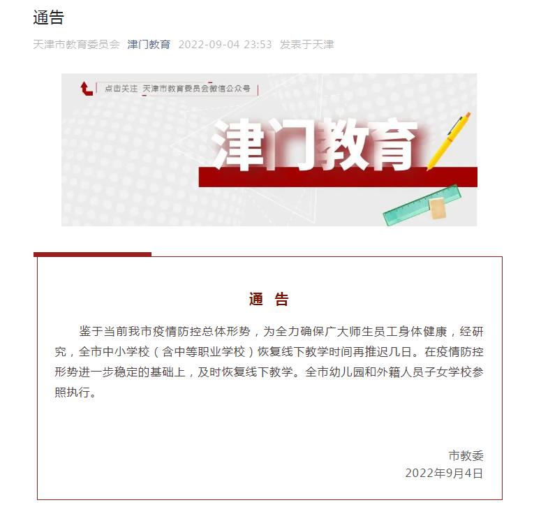 中新網(wǎng)9月5日電 天津市教育委員會(huì)4日晚在其官方微信發(fā)布通告稱,鑒于當(dāng)前天津市疫情防控總體形勢,為全力確保廣大師生員工身體健康,經(jīng)研究,全市中小學(xué)校(含中等職業(yè)學(xué)校)恢復(fù)線下教學(xué)時(shí)間再推遲幾日。在疫情防控形勢進(jìn)一步穩(wěn)定的基礎(chǔ)上,及時(shí)恢復(fù)線下教學(xué)。全市幼兒園和外籍人員子女學(xué)校參照執(zhí)行。