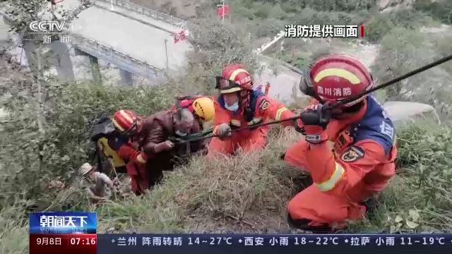 繩橋搭建完成后,消防員徒步跨過阻擋在道路中央的石塊,將小孩和病情危重的老人進行轉移。