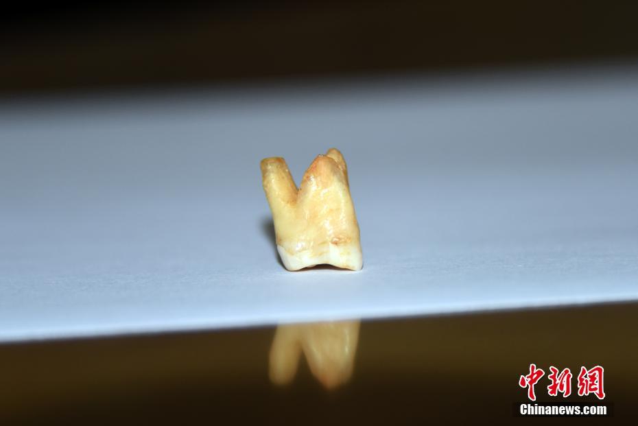 中國科學院古脊椎動物與古人類研究所(中科院古脊椎所)青年研究員吳妍帶領的研究團隊,通過對湖南道縣福巖洞遺址出土的、迄今所知東亞最早現(xiàn)代人(8-12萬年前)的牙齒化石進行牙結石提取與分析,最新研究發(fā)現(xiàn)東亞最早現(xiàn)代人植物類食物的直接證據(jù),并發(fā)現(xiàn)當時的古人類就已經有了剔牙行為。這項重要研究發(fā)現(xiàn)的成果論文,已在國際專業(yè)學術期刊《植物科學前沿》發(fā)表。圖為9月7日,北京,中科院古脊椎所標本館,展示一顆用于本次研究的湖南道縣福巖洞遺址出土、8-12萬年前東亞最早現(xiàn)代人牙齒化石標本。 中新社記者 孫自法 攝