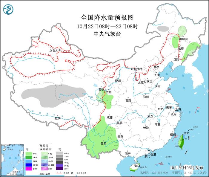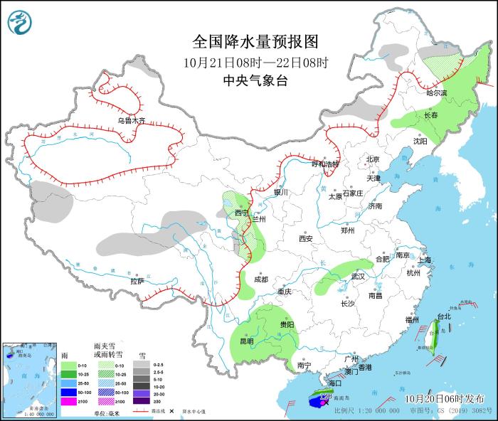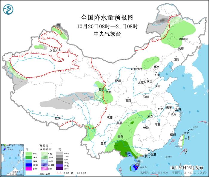 10月20日08時至21日08時,內(nèi)蒙古東北部、新疆北疆北部和南疆西南部、西藏北部、青海東部和南部等地部分地區(qū)有小到中雪或雨夾雪,其中,新疆北疆北部等地部分地區(qū)有大到暴雪。廣西西部和南部、廣東西南部、海南島等地部分地區(qū)有中到大雨,其中,廣西南部沿海、海南島中東部等地部分地區(qū)有暴雨或大暴雨(100~150毫米)。