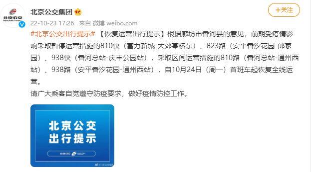 中新網(wǎng)10月23日電 北京公交集團(tuán)23日發(fā)布恢復(fù)運(yùn)營(yíng)出行提示稱,根據(jù)廊坊市香河縣的意見,前期受疫情影響采取暫停運(yùn)營(yíng)措施的810快(富力新城-大郊亭橋東)、823路(安平香汐花園-郎家園)、938快(香河總站-慶豐公園站),采取區(qū)間運(yùn)營(yíng)措施的810路(香河總站-通州西站)、938路(安平香汐花園-通州西站),自10月24日(周一)首班車起恢復(fù)全線運(yùn)營(yíng)。(中新財(cái)經(jīng))