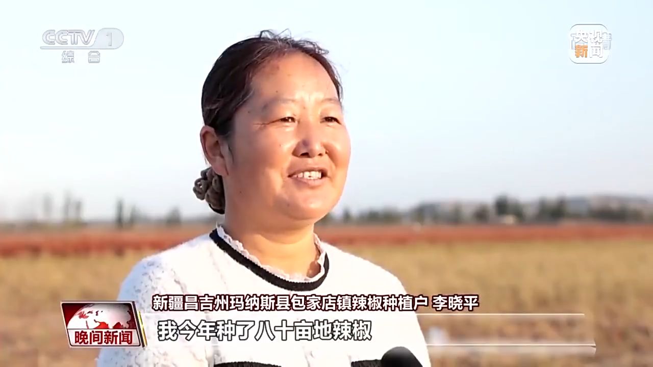 新疆昌吉州瑪納斯縣包家店鎮(zhèn)辣椒種植戶 李曉平:我今年種了八十畝地辣椒,現(xiàn)在正在機(jī)械采收,以前種這么多地,要最少得十天才能采收,現(xiàn)在機(jī)械采收省事、省力。
