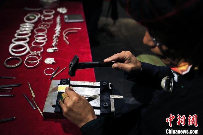 彝族銀飾制作技藝國家級非遺傳承人勒古沙日正在打制銀器。 王磊 攝