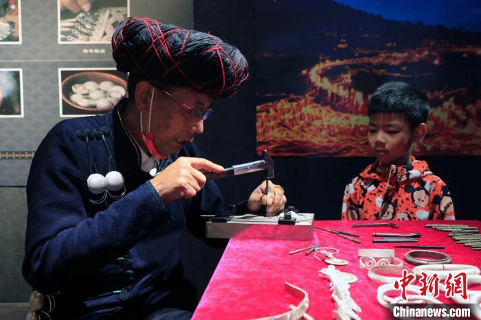 中新網(wǎng)涼山11月7日電 (王利文)“叮咚,叮咚……”6日,清脆的敲打聲從四川涼山民族體育場傳出,在“家園遺珍·時代新風(fēng)”非遺展演活動中,彝族銀飾制作技藝國家級非遺傳承人勒古沙日正在打制銀器。鷹爪銀杯、鳳冠、胸牌……現(xiàn)場一件件閃亮精致的銀器均出自這位66歲老人之手。