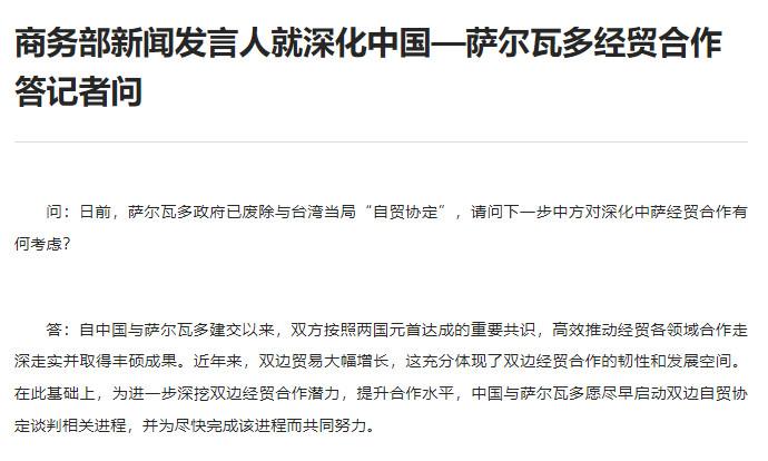 商務(wù)部新聞發(fā)言人就深化中國(guó)—薩爾瓦多經(jīng)貿(mào)合作答記者問(wèn)