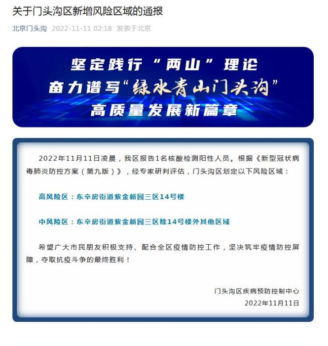 中新網(wǎng)11月11日電 據(jù)“北京門頭溝”微信公眾號(hào)消息,北京市門頭溝區(qū)疾病預(yù)防控制中心11日發(fā)布通報(bào)稱,2022年11月11日凌晨,門頭溝區(qū)報(bào)告1名核酸檢測(cè)陽(yáng)性人員。根據(jù)《新型冠狀病毒肺炎防控方案(第九版)》,經(jīng)專家研判評(píng)估,門頭溝區(qū)劃定以下風(fēng)險(xiǎn)區(qū)域:
