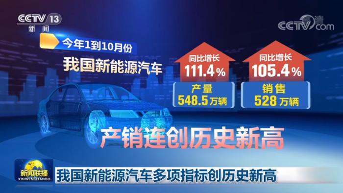 央視網(wǎng)消息(新聞聯(lián)播):今年前十個(gè)月,我國新能源汽車產(chǎn)銷量、出口量等多項(xiàng)指標(biāo)創(chuàng)歷史新高。