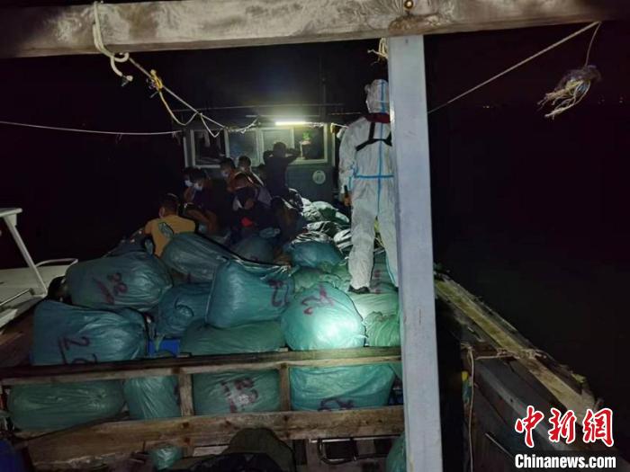 案發(fā)當晚22時許,防城港海警局東興第一工作站執(zhí)法員在海域巡邏時,發(fā)現(xiàn)一艘裝有大量袋裝貨物的漁船,形跡可疑。執(zhí)法員隨即向可疑船鳴笛、喊話亮明身份,要求其立即停船接受檢查,執(zhí)法員穿戴好防護裝具后,登臨對船上人員進行控制。