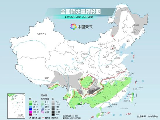 中國(guó)天氣網(wǎng)訊 在冷空氣與西南暖濕氣流配合之下,今天(12月28日),南方各地降水繼續(xù)發(fā)展。預(yù)計(jì),湖南、貴州、云南等地局地有中雪或大雪,降溫重心也集中到了長(zhǎng)江以南地區(qū),各地濕冷加重,上述地區(qū)公眾需做好防范雨雪和防寒保暖工作。