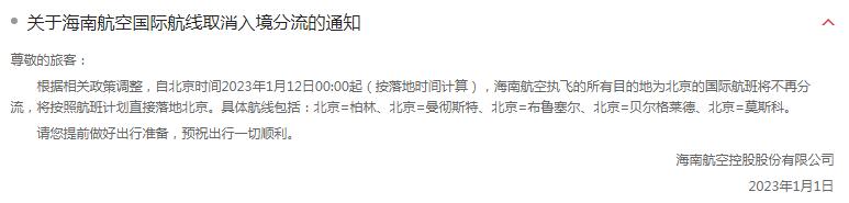 海南航空:1月12日起目的地為北京的國際航班將不再分流