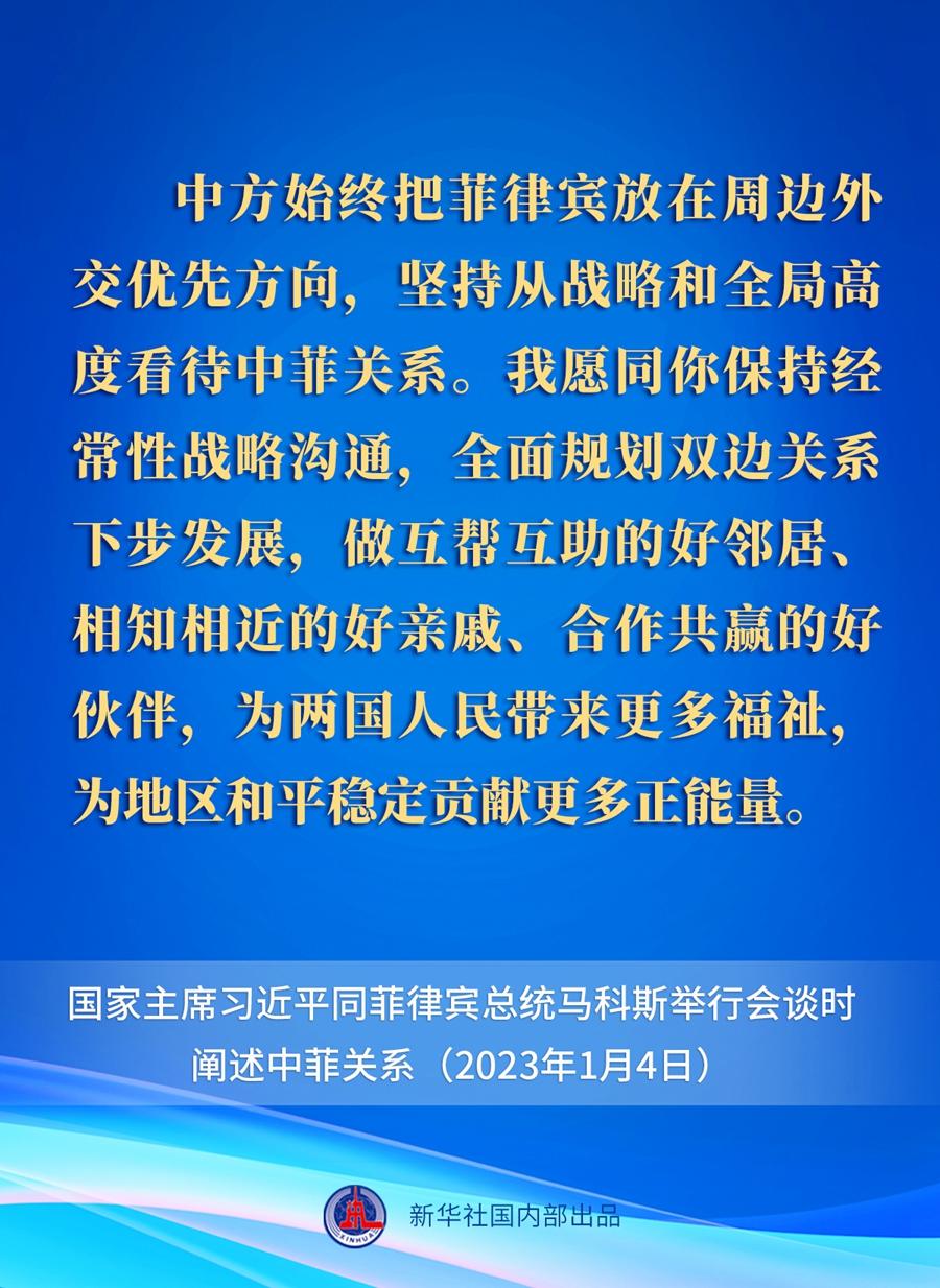 1月4日下午,國家主席習近平在人民大會堂同來華進行國事訪問的菲律賓總統(tǒng)馬科斯舉行會談。關于中菲關系,習近平主席在會談中作出一系列重要闡述。一起來看要點。