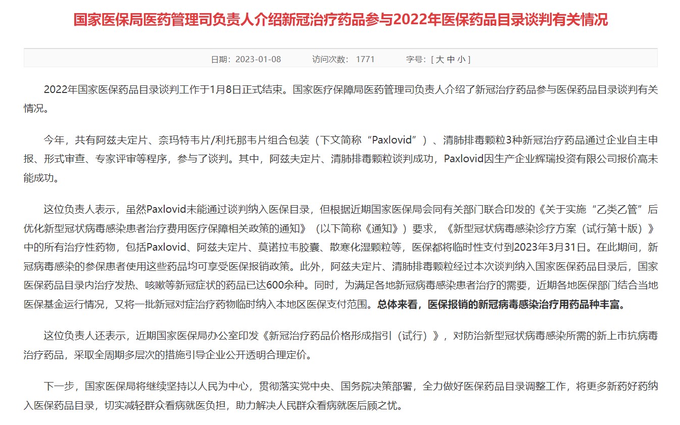 其中,阿茲夫定片、清肺排毒顆粒談判成功,Paxlovid因生產(chǎn)企業(yè)輝瑞投資有限公司報(bào)價高未能成功。