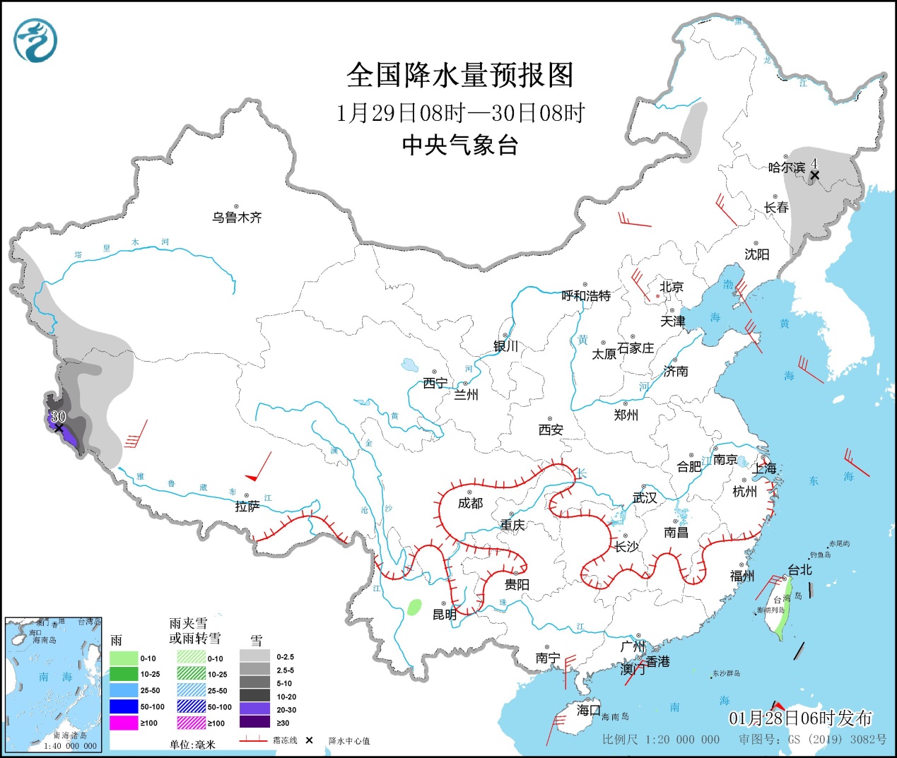 28日至30日,內(nèi)蒙古東北部、東北地區(qū)有降雪天氣,以小雪為主;29日至31日,西藏西部有小到中雪,部分地區(qū)有大到暴雪,局地大暴雪。