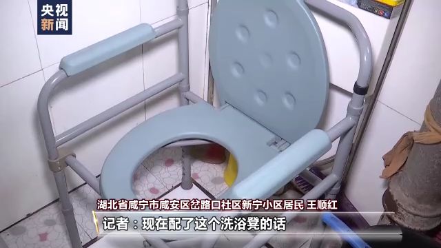 湖北省咸寧市咸安區(qū)岔路口社區(qū)新寧小區(qū)居民 王順紅:原來就用盆,給他擦洗。現(xiàn)在方便多了,洗浴凳又穩(wěn),不怕摔跤,帶來很大的方便。