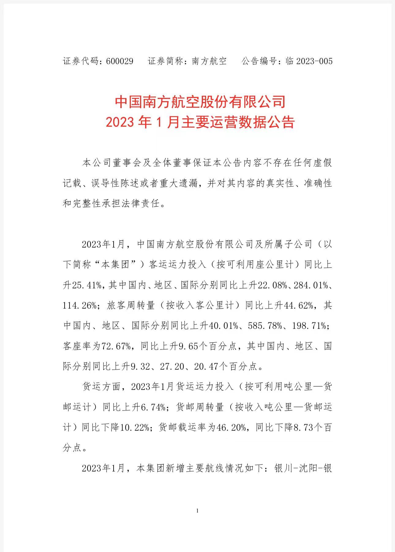 2023年1月,南方航空及所屬子公司客運運力投入(按可利用座公里計)同比上升25.41%,旅客周轉(zhuǎn)量(按收入客公里計)同比上升44.62%。(中新財經(jīng))