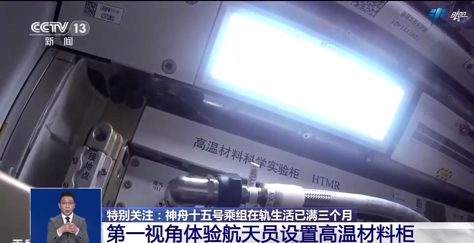 畫面中是航天員們正在設(shè)置高溫材料科學(xué)實(shí)驗(yàn)柜,這是支持在空間站微重力環(huán)境下進(jìn)行材料制備、加工、原位檢測(cè)、實(shí)時(shí)觀察和診斷于一體的新型實(shí)驗(yàn)裝置。最高加熱溫度能達(dá)到1600℃,溫度的穩(wěn)定度能達(dá)到±0.25℃,這個(gè)高溫材料科學(xué)實(shí)驗(yàn)柜的工作溫度、穩(wěn)定度和樣品數(shù)量、實(shí)時(shí)觀察成像技術(shù)均處于國際領(lǐng)先水平。