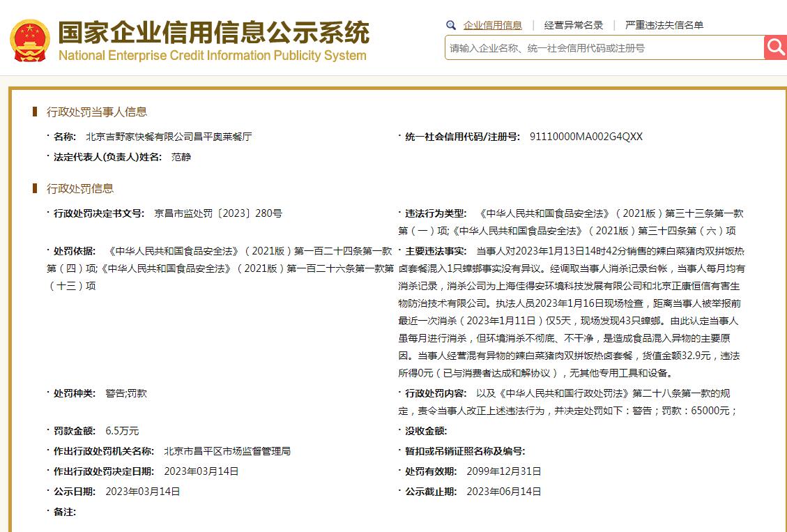 吉野家一餐廳飯菜混入蟑螂被罰6.5萬(wàn)元