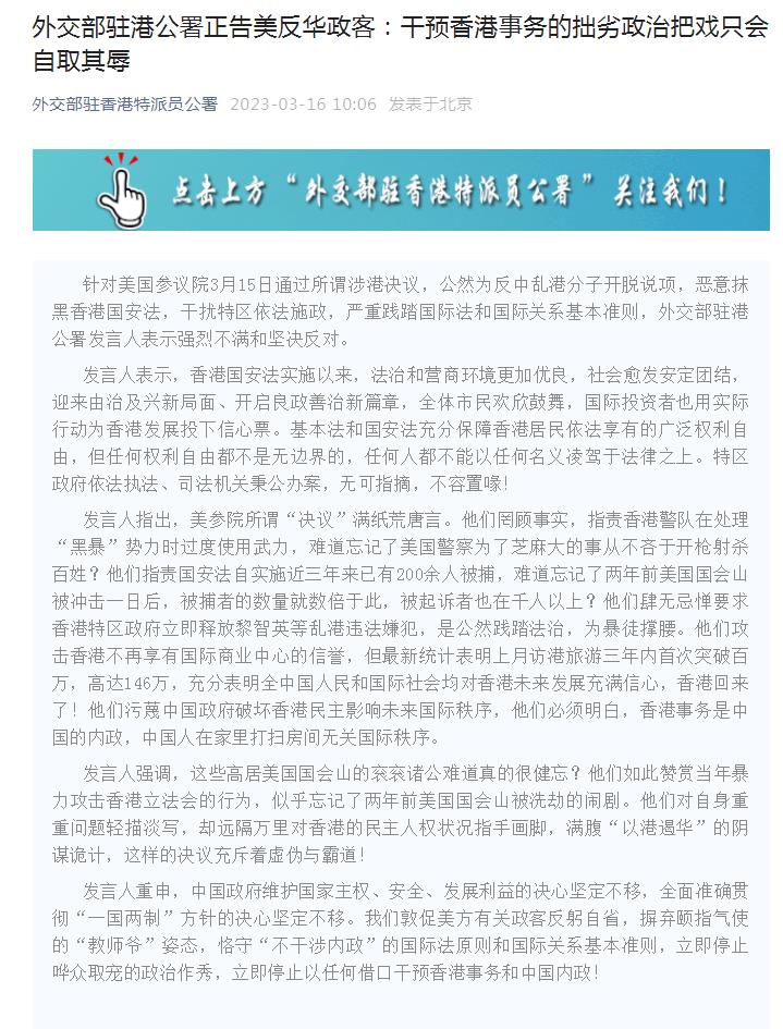 中新網(wǎng)3月16日電 據(jù)外交部駐港公署微信公眾號(hào)消息,針對(duì)美國(guó)參議院3月15日通過(guò)所謂涉港決議,公然為反中亂港分子開(kāi)脫說(shuō)項(xiàng),惡意抹黑香港國(guó)安法,干擾特區(qū)依法施政,嚴(yán)重踐踏國(guó)際法和國(guó)際關(guān)系基本準(zhǔn)則,外交部駐港公署發(fā)言人表示強(qiáng)烈不滿和堅(jiān)決反對(duì)。