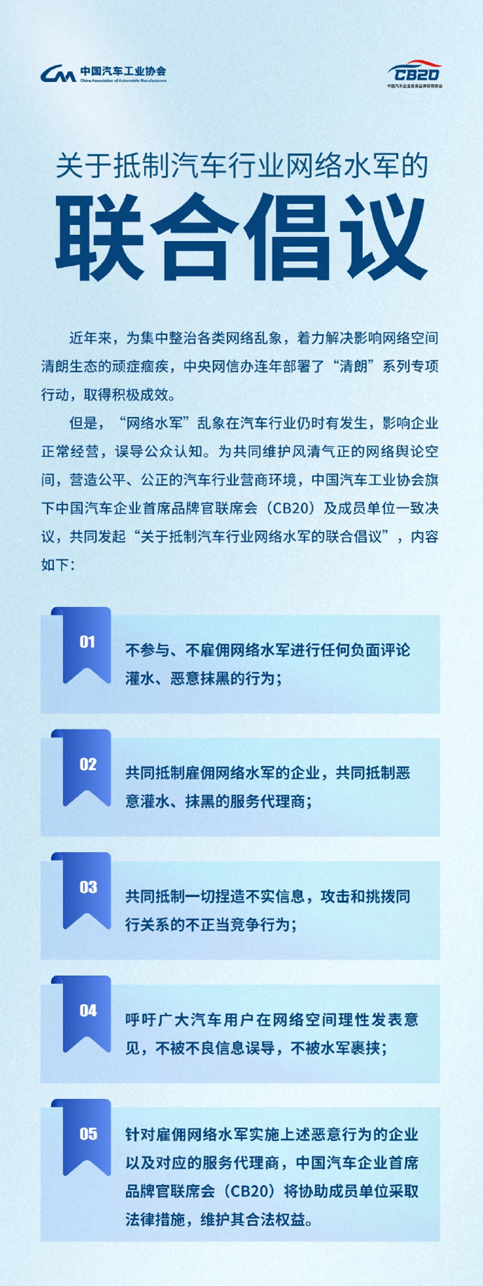 中新網(wǎng)3月24日電(中新財經(jīng) 葛成) 24日,中新財經(jīng)從中汽協(xié)獲悉,為共同維護(hù)風(fēng)清氣正的網(wǎng)絡(luò)輿論空間,營造公平、公正的汽車行業(yè)營商環(huán)境,中國汽車工業(yè)協(xié)會旗下中國汽車企業(yè)首席品牌官聯(lián)席會(CB20)及成員單位一致決議,共同發(fā)起“關(guān)于抵制汽車行業(yè)網(wǎng)絡(luò)水軍的聯(lián)合倡議”。