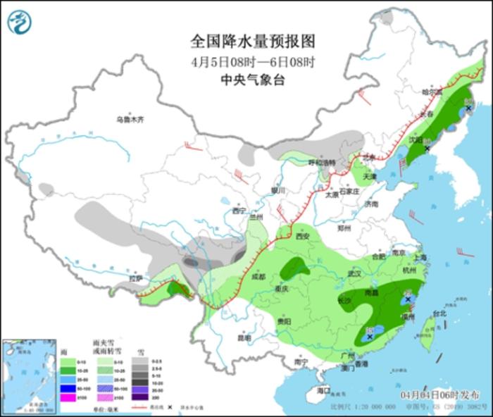 4月5日08時(shí)至6日08時(shí),內(nèi)蒙古中部、西藏北部和東部、青海南部、川西高原等地部分地區(qū)有小到中雪或雨夾雪,局地有大雪。東北地區(qū)東部和南部、西北地區(qū)東南部、江淮西部、江漢、江南、西南地區(qū)東部、華南大部、臺(tái)灣島等地部分地區(qū)有小到中雨,其中,吉林東部、遼寧東部、江西南部、福建北部、廣東東北部等地局地有大雨(25~45毫米)。內(nèi)蒙古中東部、甘肅等地部分地區(qū)有4~6級(jí)風(fēng),其中,甘肅河西部分地區(qū)有6~7級(jí)風(fēng)(見圖4)。渤海、渤海海峽、黃海中部和東南部海域?qū)⒂?級(jí)、陣風(fēng)9級(jí)的大風(fēng),其中渤海和黃海中東部的部分海域風(fēng)力可達(dá)9級(jí)、陣風(fēng)10級(jí)。