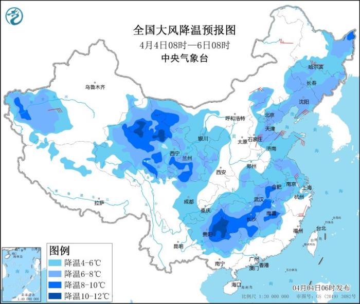 圖2 全國(guó)大風(fēng)降溫預(yù)報(bào)圖(4月4日08時(shí)至6日08時(shí))