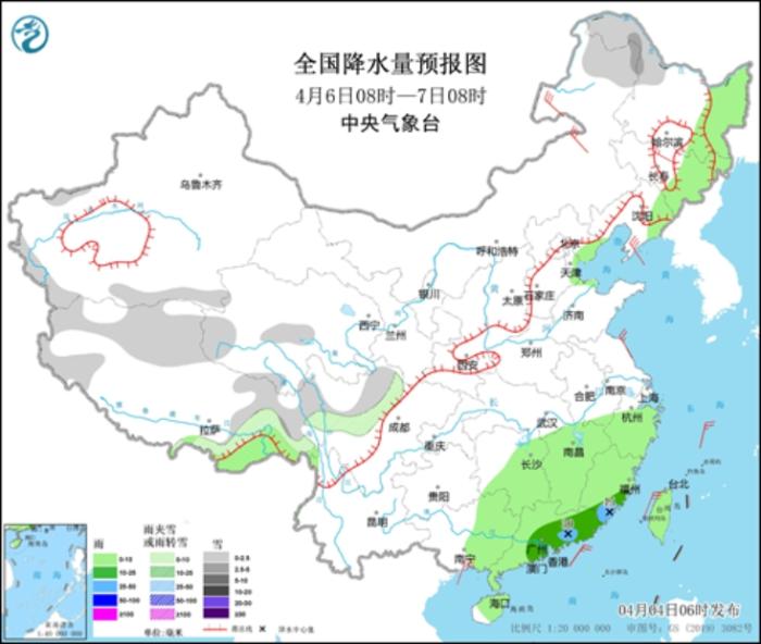 4月6日08時(shí)至7日08時(shí),內(nèi)蒙古東北部、黑龍江西北部、新疆南疆盆地和南疆西部山區(qū)、西藏北部和東部、青海南部、川西高原北部等地部分地區(qū)有小雪或雨夾雪,局地有中雪。東北地區(qū)東部、西藏東南部、河北東北部、天津東部、江南中東部、華南大部、臺(tái)灣島等地部分地區(qū)有小到中雨,其中,福建東南部、廣東東南部等地局地有大雨(25~45毫米)。內(nèi)蒙古東北部和中部、吉林中部等地部分地區(qū)有4~6級(jí)風(fēng)(見圖5)。渤海、渤海海峽、黃海北部海域?qū)⒂?~7級(jí)、陣風(fēng)8級(jí)的偏北風(fēng)。