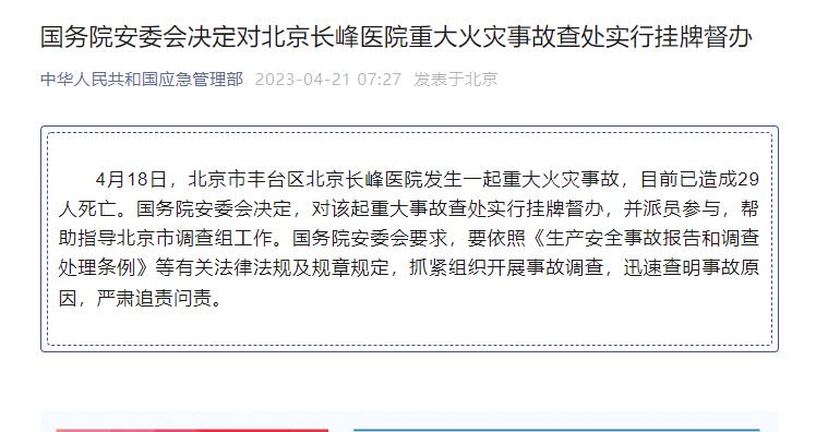 國務(wù)院安委會(huì)決定對北京長峰醫(yī)院重大火災(zāi)事故查處實(shí)行掛牌督辦