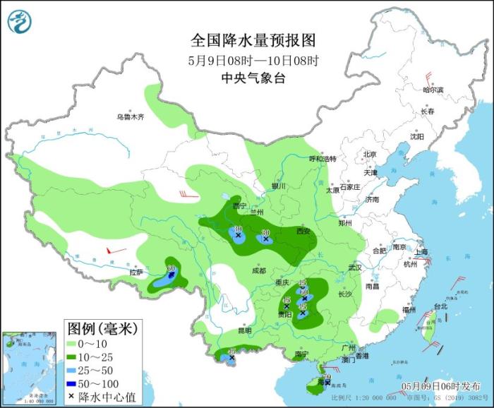 全國降水量預報圖(5月9日08時-10日08時)