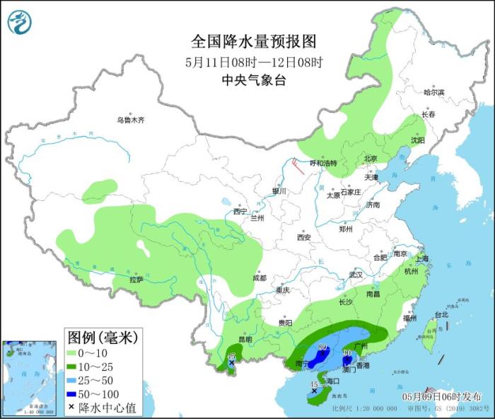 全國降水量預報圖(5月10日08時-11日08時)