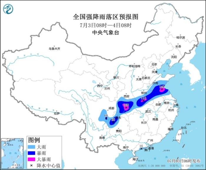 7月3日08時(shí)至4日08時(shí),山東中南部、江蘇北部、安徽北部、河南東部和南部、湖北北部和西部、陜西南部、重慶、四川東部、貴州西北部、云南東北部以及廣東西南部沿海等地部分地區(qū)有大到暴雨,其中,山東南部、江蘇北部、河南南部、重慶北部、四川東北部等地局地有大暴雨(100~160毫米)。內(nèi)蒙古中西部、甘肅中北部、青海北部等地部分地區(qū)有4~6級風(fēng)。
