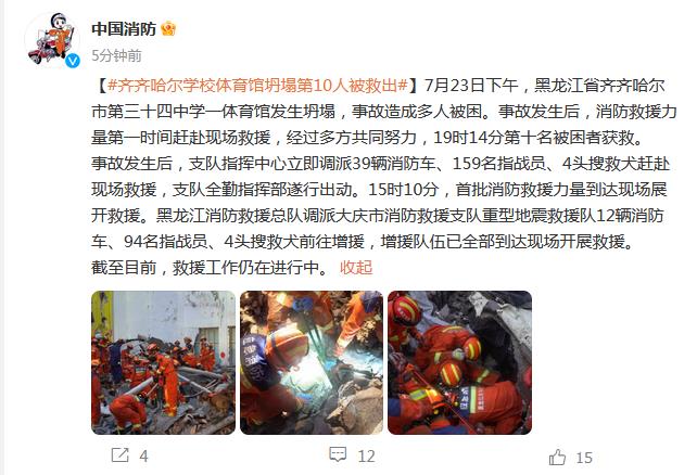 中新網(wǎng)7月23日電 據(jù)中國消防官微消息,7月23日下午,黑龍江省齊齊哈爾市第三十四中學(xué)一體育館發(fā)生坍塌,事故造成多人被困。事故發(fā)生后,消防救援力量第一時間趕赴現(xiàn)場救援,經(jīng)過多方共同努力,19時14分第十名被困者獲救。