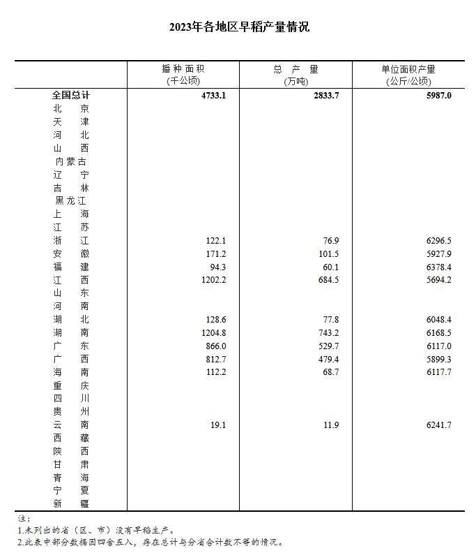 中新網(wǎng)8月23日電 國家統(tǒng)計局網(wǎng)站23日發(fā)布關于2023年早稻產(chǎn)量數(shù)據(jù)的公告。根據(jù)早稻抽樣調(diào)查結果推算,2023年全國早稻播種面積、單位面積產(chǎn)量、總產(chǎn)量如下: