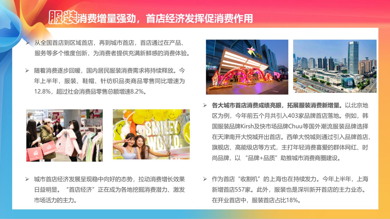 在服裝消費方面,隨著消費逐步回暖,國內(nèi)居民服裝消費需求將持續(xù)釋放。以北京地區(qū)為例,今年前五個月共引入403家品牌首店落地。例如,韓國服裝品牌Kirsh及快市場品牌Chuu等國外潮流服裝品牌選擇在天津南開大悅城開出首店。西單大悅城則通過引入品牌首店、旗艦店、高能級店等方式,主打年輕消費喜愛的群體網(wǎng)紅、時尚品牌,以“品牌+品質(zhì)”助推城市消費商圈建設(shè)?!秷蟾妗氛J(rèn)為,“首店經(jīng)濟(jì)”正在成為各地挖掘消費潛力、激發(fā)市場活力的主力。