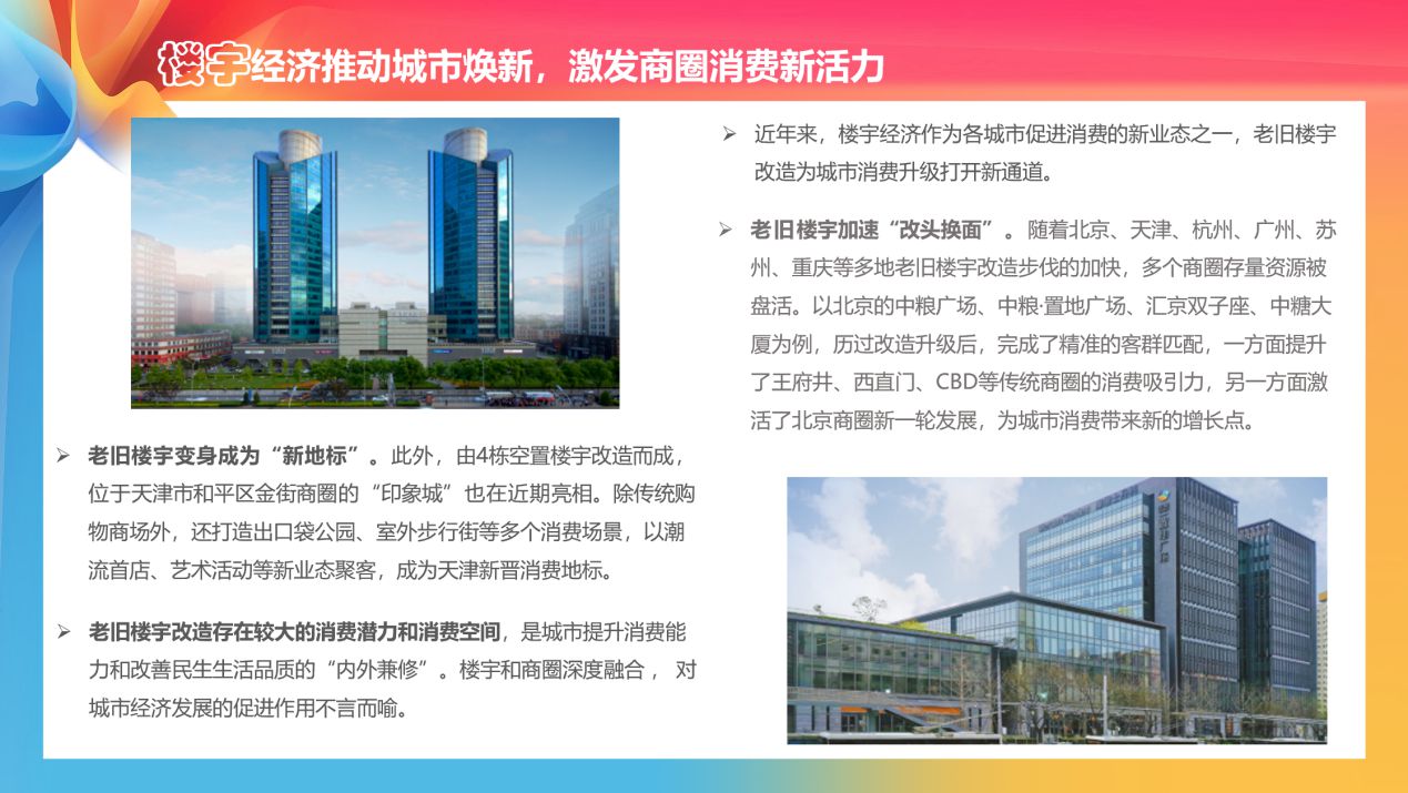 老舊樓宇改造存在較大的消費潛力和消費空間,是城市提升消費能力和改善民生生活品質(zhì)的“內(nèi)外兼修”。《報告》梳理指出,隨著北京、天津、杭州、廣州、蘇州、重慶等多地老舊樓宇改造步伐的加快,多個商圈存量資源被盤活。以北京的中糧廣場、中糧·置地廣場、匯京雙子座、中糖大廈為例,通過舊改提升、輕(中)資產(chǎn)輸出等方式,打造高端商務(wù)地標(biāo),完成了精準(zhǔn)的客群匹配,一方面提升了王府井、西直門、CBD等傳統(tǒng)商圈的消費吸引力,另一方面激活了北京商圈新一輪發(fā)展,推動片區(qū)重構(gòu)和能級提升,為城市消費帶來新的增長點。