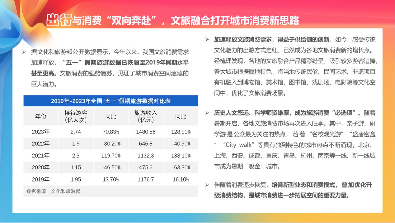 在出行方面,感受傳統(tǒng)文化魅力的出游方式走紅,已然成為各地文旅消費新的增長點。隨著暑期開啟,各地文旅消費市場再次進(jìn)入旺季。其中,親子游、研學(xué)游是公眾最為關(guān)注的熱點。伴隨著消費逐步恢復(fù),培育新型業(yè)態(tài)和消費模式,疊加優(yōu)化升級消費結(jié)構(gòu),是城市消費進(jìn)一步拓展空間的重要力量。