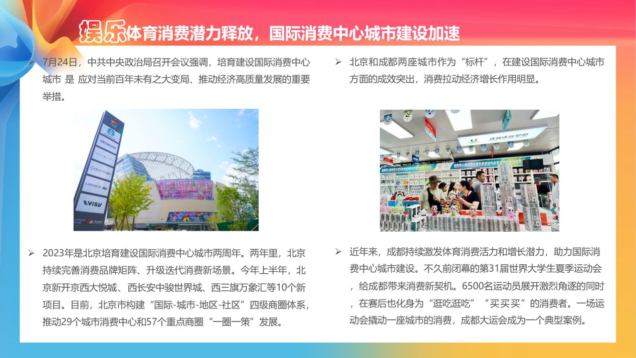 在娛樂體育消費方面,北京、成都兩座城市作為“標(biāo)桿”,在建設(shè)國際消費中心城市方面的成效突出,消費拉動經(jīng)濟(jì)增長作用明顯。以北京為例,2023年是北京培育建設(shè)國際消費中心城市兩周年。兩年里,北京持續(xù)完善消費品牌矩陣、升級迭代消費新場景。今年上半年,北京新開京西大悅城、西長安中駿世界城、西三旗萬象匯等10個新項目。目前,北京市構(gòu)建“國際-城市-地區(qū)-社區(qū)”四級商圈體系,推動29個城市消費中心和57個重點商圈“一圈一策”發(fā)展。