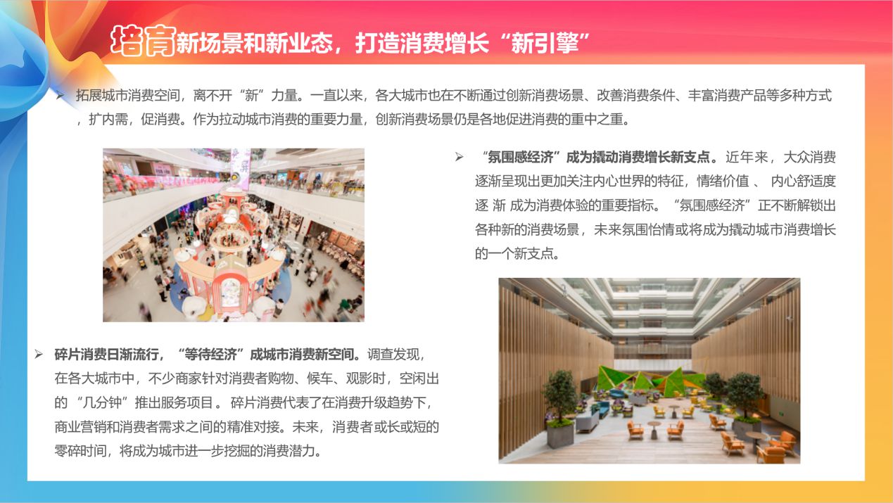《報告》表示,拓展城市消費空間,離不開“新”力量。一直以來,各大城市也在不斷通過創(chuàng)新消費場景、改善消費條件、豐富消費產(chǎn)品等多種方式,擴(kuò)內(nèi)需,促消費。作為拉動城市消費的重要力量,創(chuàng)新消費場景仍是各地促進(jìn)消費的重中之重。