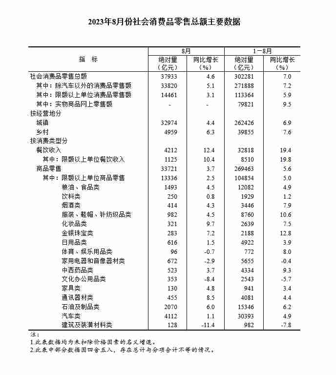 國家統(tǒng)計(jì)局:2023年8月份社會(huì)消費(fèi)品零售總額增長4.6%