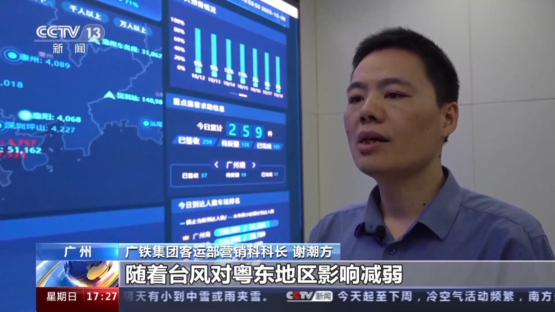 廣鐵集團客運部營銷科科長謝潮方:隨著臺風對粵東地區(qū)影響減弱,今天,杭深、廣汕等線路列車運行秩序恢復(fù)正常。中秋國慶假期的后幾天,仍是返程客流高峰,我們將加強線路檢查,確保運輸安全。