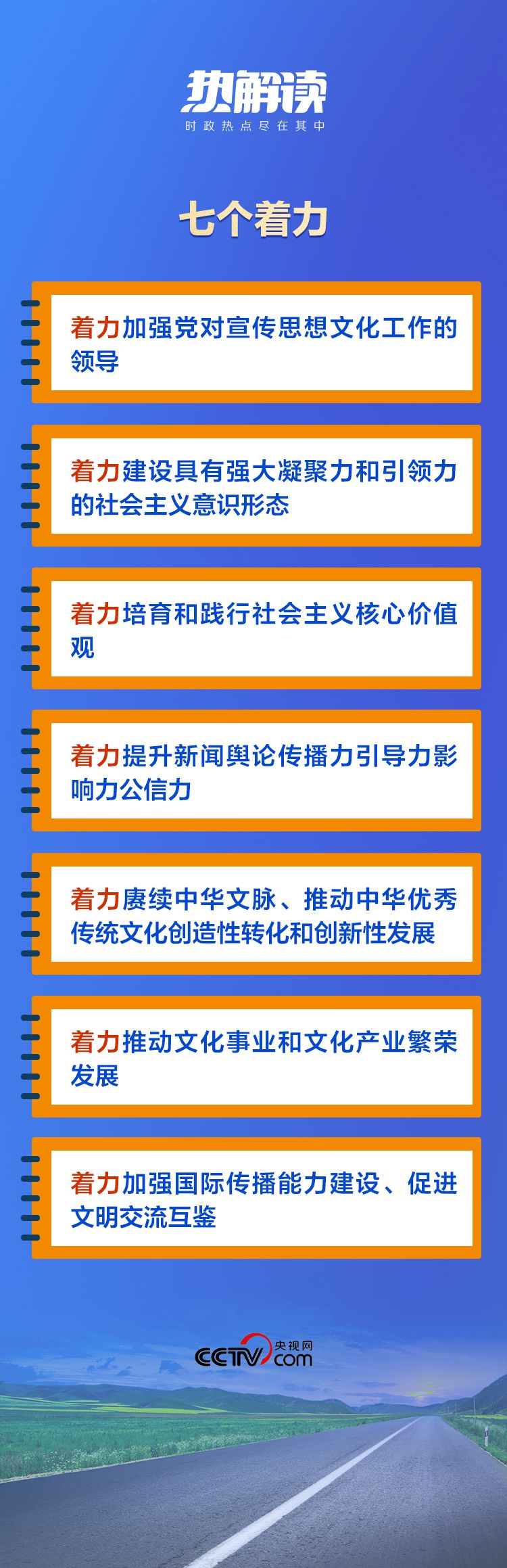 在這次對宣傳思想文化工作的重要指示中,總書記提出了“七個(gè)著力”的重要要求,為新時(shí)代文化建設(shè)明確了路線圖和任務(wù)書。