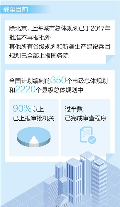自然資源部國(guó)土空間規(guī)劃局局長(zhǎng)張兵介紹,截至目前,除北京、上海城市總體規(guī)劃已于2017年批準(zhǔn)不再報(bào)批外,其他所有省級(jí)規(guī)劃和新疆生產(chǎn)建設(shè)兵團(tuán)規(guī)劃已全部上報(bào)國(guó)務(wù)院,其中江蘇、廣東、寧夏等省級(jí)規(guī)劃已經(jīng)批復(fù)。全國(guó)計(jì)劃編制的350個(gè)市級(jí)總體規(guī)劃和2220個(gè)縣級(jí)總體規(guī)劃中,90%以上已上報(bào)審批機(jī)關(guān),過(guò)半數(shù)已完成審查程序,江蘇、廣東的部分市級(jí)總體規(guī)劃已由省級(jí)人民政府批準(zhǔn)實(shí)施。