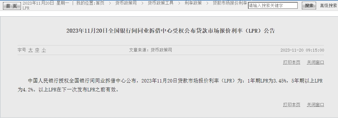 中新網(wǎng)11月20日電 據(jù)央行網(wǎng)站消息,中國人民銀行授權(quán)全國銀行間同業(yè)拆借中心公布,2023年11月20日貸款市場(chǎng)報(bào)價(jià)利率(LPR)為:1年期LPR為3.45%,5年期以上LPR為4.2%。以上LPR在下一次發(fā)布LPR之前有效。