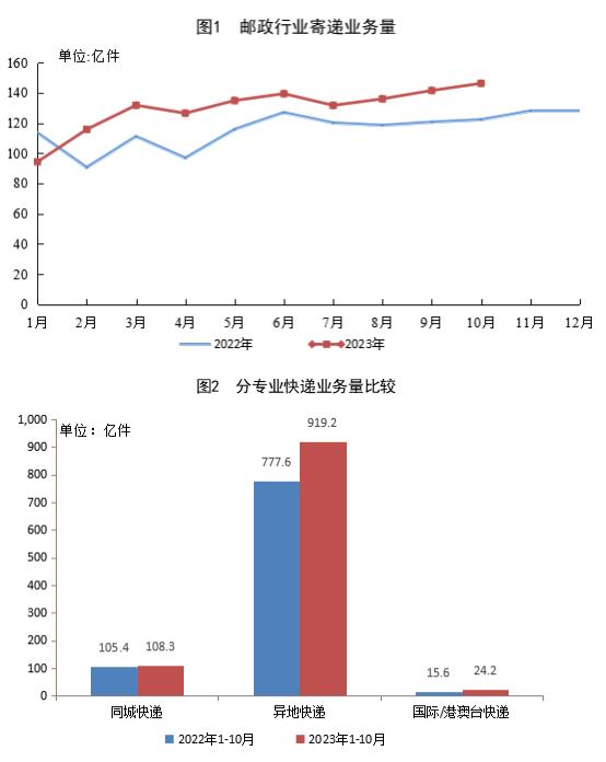 1-10月,同城快遞業(yè)務(wù)量累計完成108.3億件,同比增長2.7%;異地快遞業(yè)務(wù)量累計完成919.2億件,同比增長18.2%;國際/港澳臺快遞業(yè)務(wù)量累計完成24.2億件,同比增長55.1%。