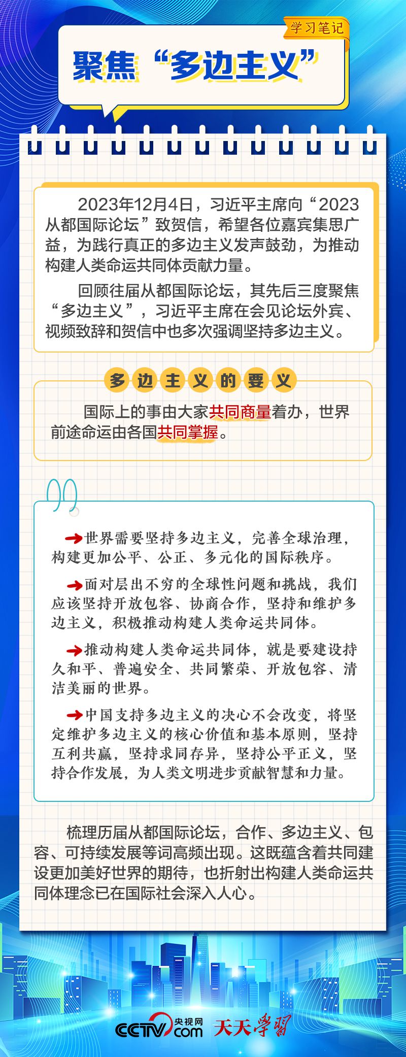 天天學(xué)習(xí) 12月4日,習(xí)近平主席在致“2023從都國際論壇”的賀信中強(qiáng)調(diào),面對前所未有的世界之變、時(shí)代之變和歷史之變,人類社會必須團(tuán)結(jié)起來,堅(jiān)持互學(xué)互鑒、開放包容、合作共贏,弘揚(yáng)全人類共同價(jià)值,共同建設(shè)更加美好的世界。