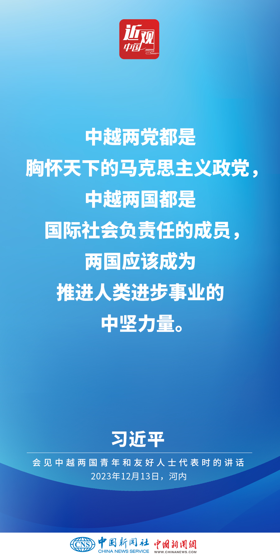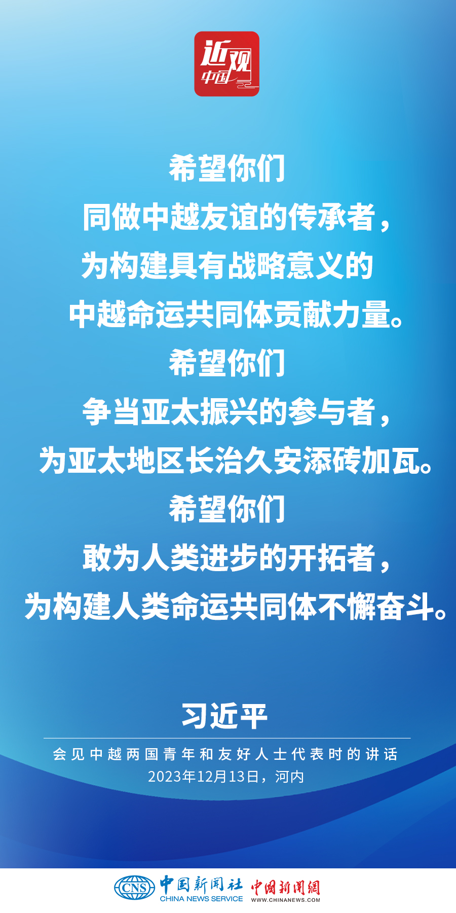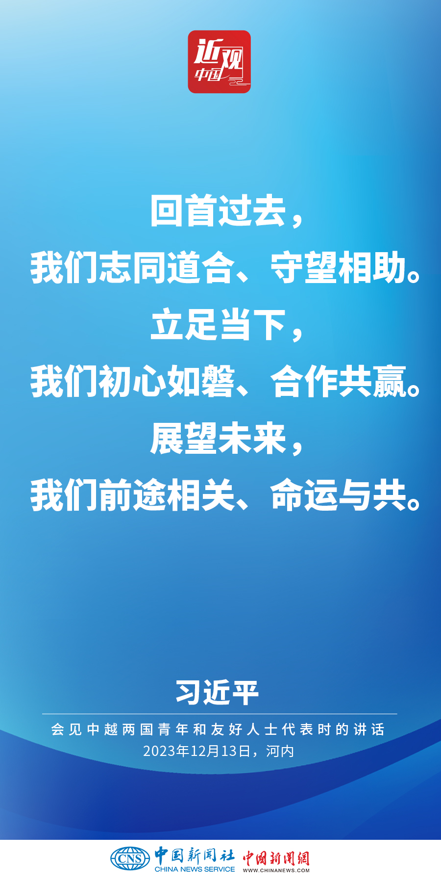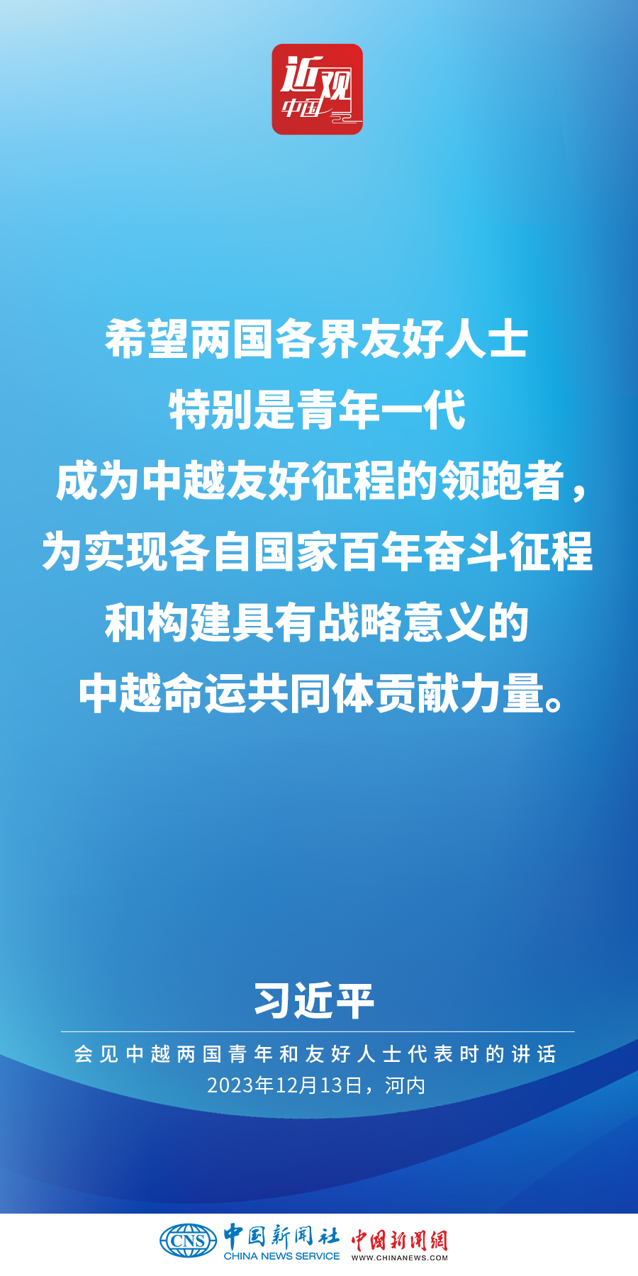 當(dāng)?shù)貢r間12月13日下午,中共中央總書記、國家主席習(xí)近平和夫人彭麗媛在河內(nèi)同越共中央總書記阮富仲夫婦共同會見中越兩國青年和友好人士代表。他在題為《賡續(xù)傳統(tǒng)友誼,開創(chuàng)中越命運(yùn)共同體建設(shè)新征程》的重要講話中指出,展望未來,我們要始終不忘初心,牢記使命,攜手走好各自社會主義道路,讓工業(yè)化現(xiàn)代化建設(shè)成果更多惠及兩國人民,共同為人類進(jìn)步事業(yè)作出更大貢獻(xiàn)。