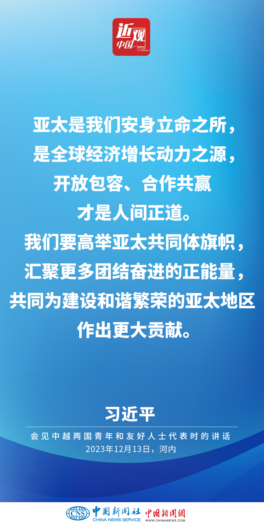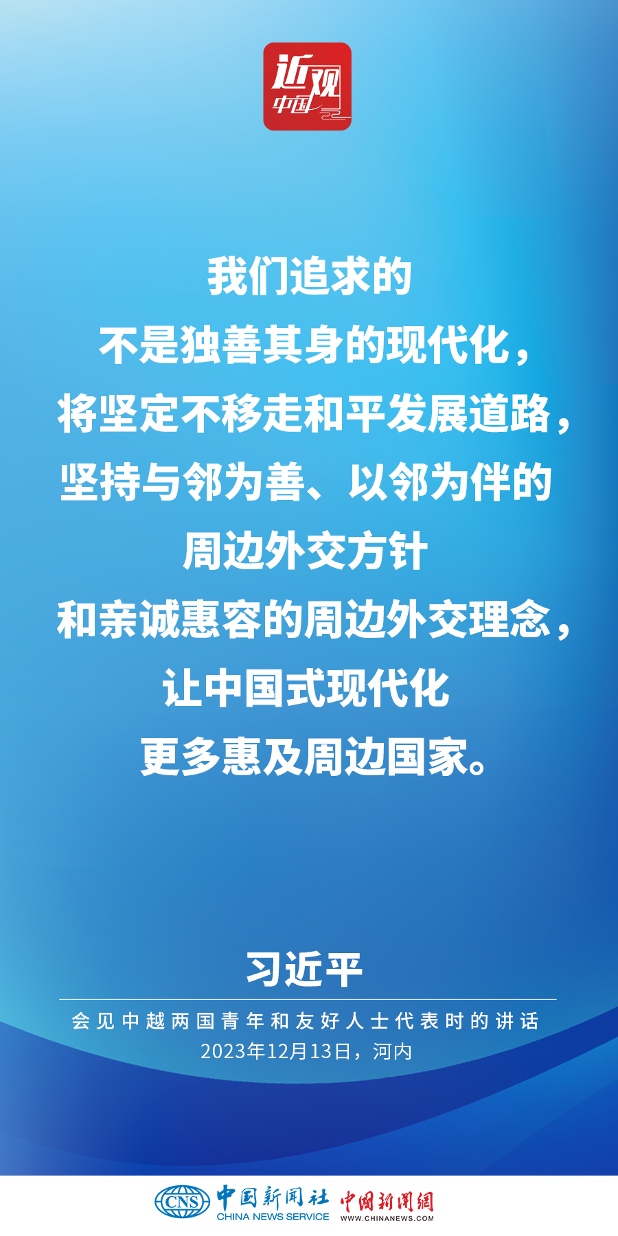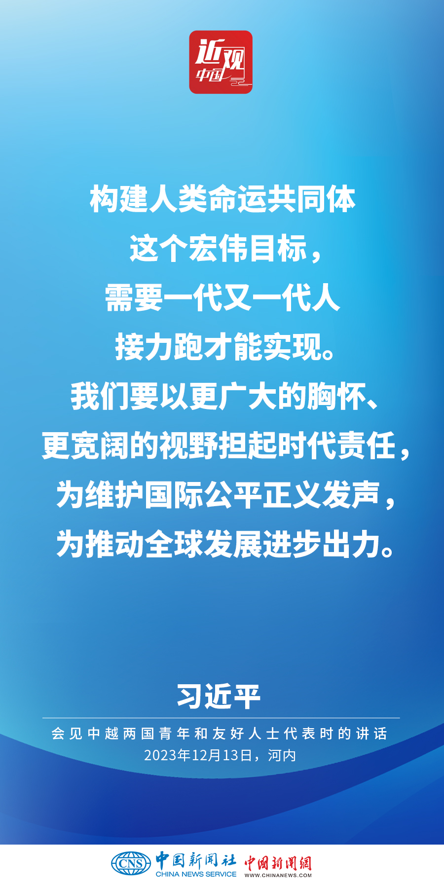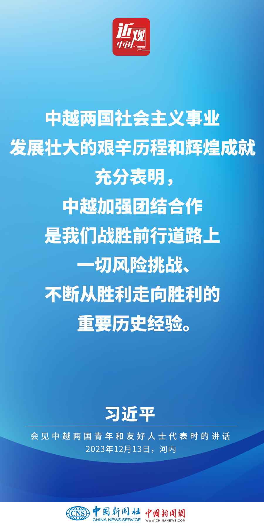 當(dāng)?shù)貢r間12月13日下午,中共中央總書記、國家主席習(xí)近平和夫人彭麗媛在河內(nèi)同越共中央總書記阮富仲夫婦共同會見中越兩國青年和友好人士代表。他在題為《賡續(xù)傳統(tǒng)友誼,開創(chuàng)中越命運(yùn)共同體建設(shè)新征程》的重要講話中指出,展望未來,我們要始終不忘初心,牢記使命,攜手走好各自社會主義道路,讓工業(yè)化現(xiàn)代化建設(shè)成果更多惠及兩國人民,共同為人類進(jìn)步事業(yè)作出更大貢獻(xiàn)。